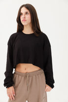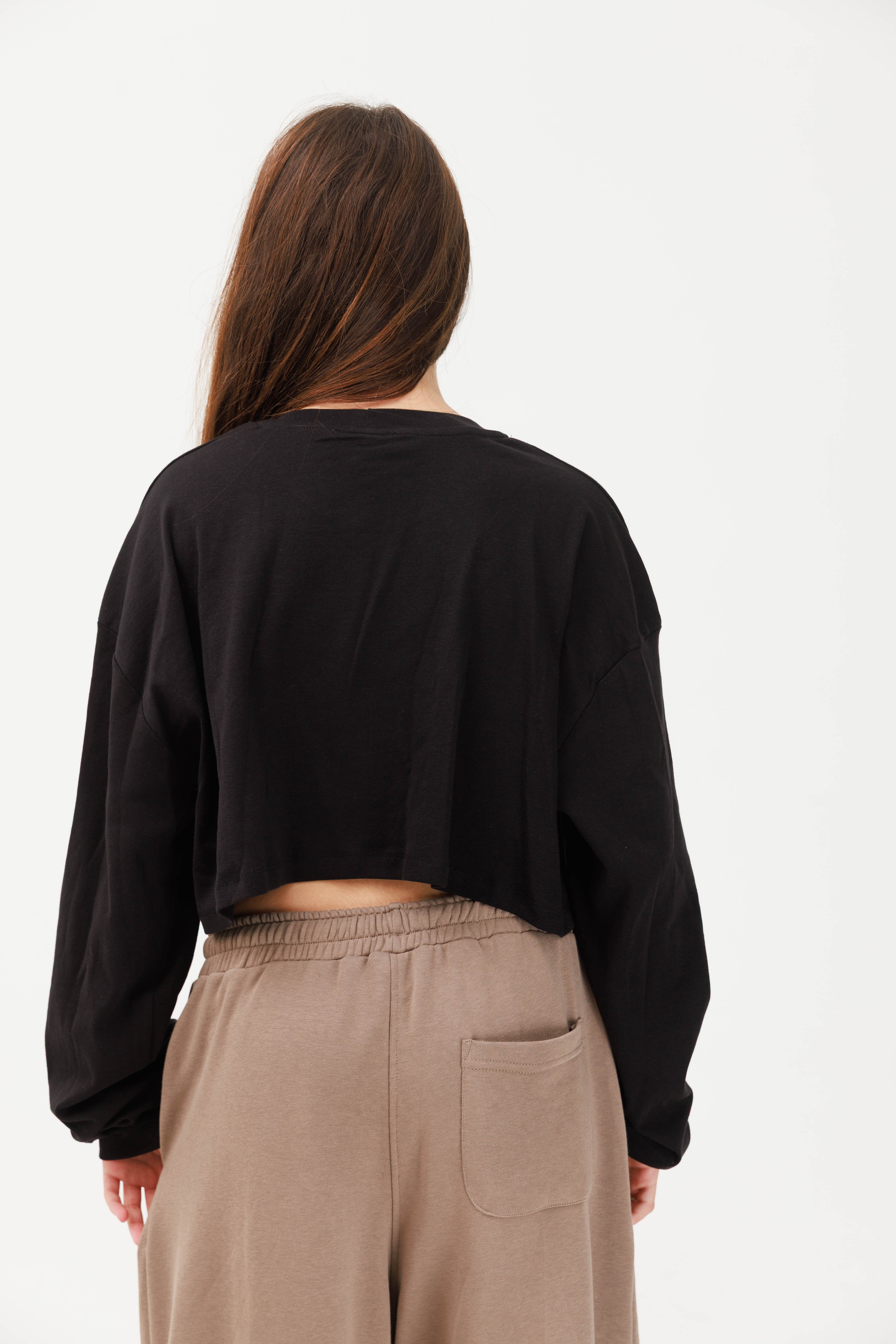 חולצת אוברסייז קרופ שרוול ארוך בצבע שחור עם רקמה שחורה